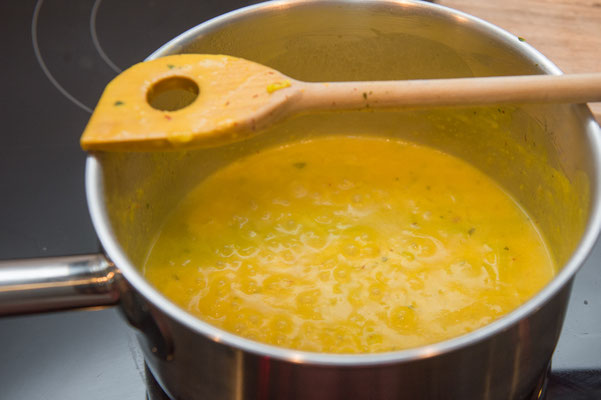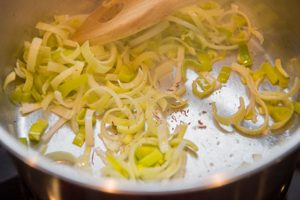 Mit Bouillon ablöschen, zugedeckt ca. 15 Minuten köcheln. Eingeweichter Safran dazu geben.
